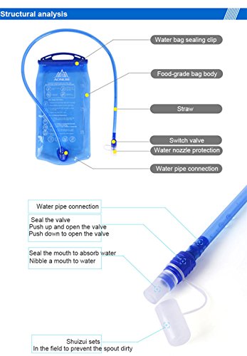 Studio : AONIJIE Publisher : AONIJIE Product Description Material: EVA Color:Blue Capacity: 1L / 1.5L / 2L / 3L Size :1L(16.5*24.5cm)/1.5(17.5*31.3)/2L(17.5*35.5)/3L(20.5*38.5) Water pipe Length:104cm Tempreture: -20¡a C~ 50¡a C Weight: 1L£¨120g£ⓒ/1.5L(140g)/2L(150g)/3L(160g) Usage: Outdoor sports, Cycling, Running, Hiking, Camping, Climbing, etc. Warmly note: 1. Do not add hot water, wine, milk, juice and other drinks to the bag. 2. Please clean the bag carefully before use. 3. Please check the water pipe connections before use, tighten the cap after adding wtaer to prevent leakage. Please turn off the switch after drinking.