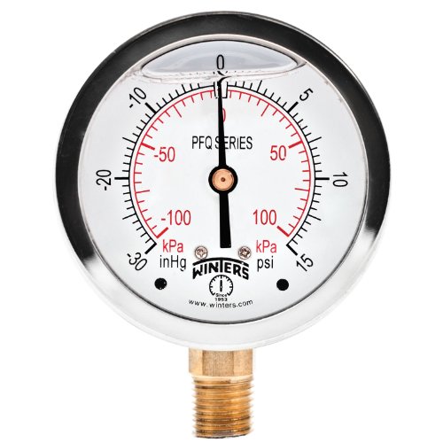 Winters PFQ Series Stainless Steel 304 Dual Scale Liquid Filled Pressure Gauge with Brass Internals, 30" Hg Vacuum-0-15 psi/kpa,2-1/2" Dial Display, +/-1.5% Accuracy, 1/4" NPT Bottom Mount