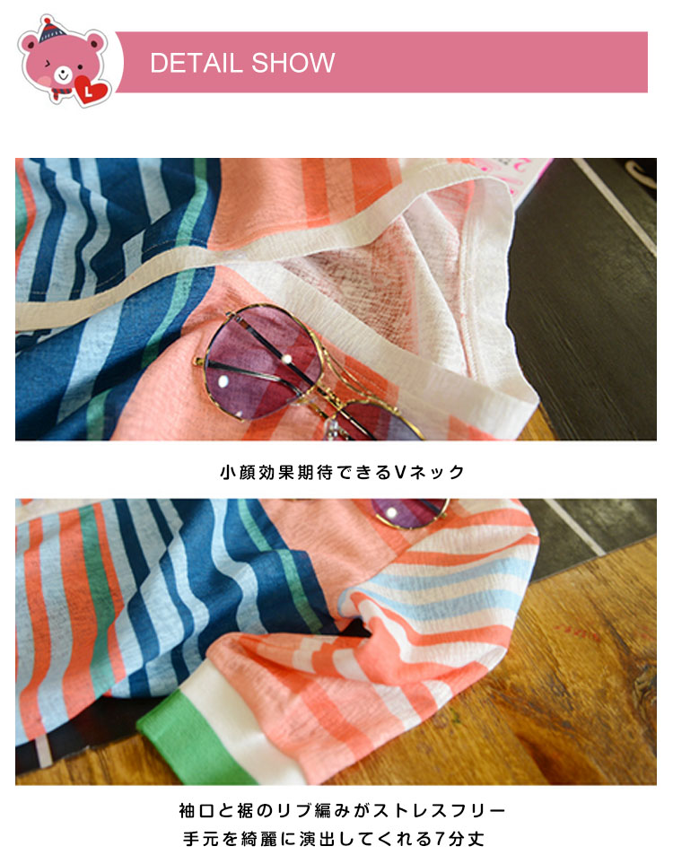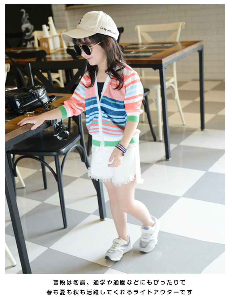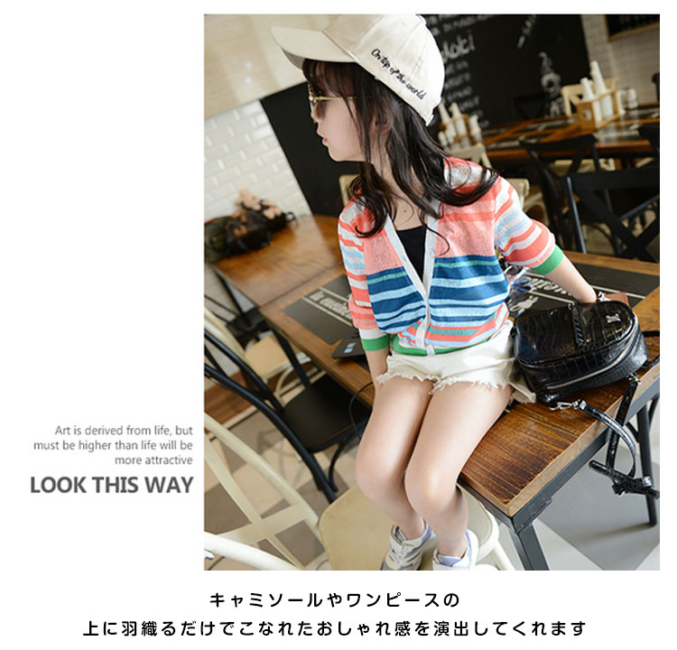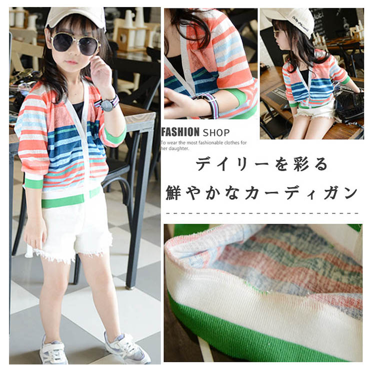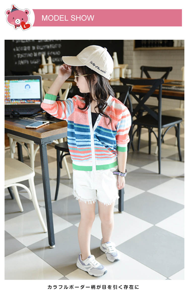 | デイリーを彩る鮮やかなカーディガンカラフルボーダー柄が目を引く存在にキャミソールやワンピースの上に羽織るだけでこなれたおしゃれ感を演出してくれます普段は勿論、通学や通園などにもぴったりで春も夏も秋も活躍してくれるライトアウターです | |