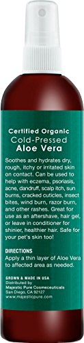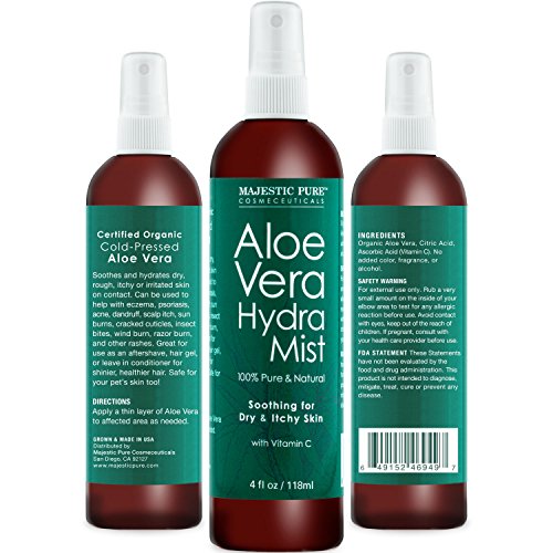 -. Feature : Majestic Pure Aloe Vera Hydra Mist, Pure & Natural, from Certified Organic Cold-Pressed Aloe Vera with Vitamin C / Soothes and hydrates dry, rough, itchy or irritated skin on contact / SAFETY WARNING: For external use only. Rub a very small amount on the inside of your elbow area to test for any allergic reaction before use. Avoid contact with eyes, keep out of the reach of children. If pregnant, consult with your health care provider before use. / Great for use as an aftershave, hair gel, or leave in conditioner for shinier, healthier hair; safe for pet's skin / Majestic Pure Aloe Vera mist is a cruelty free product
