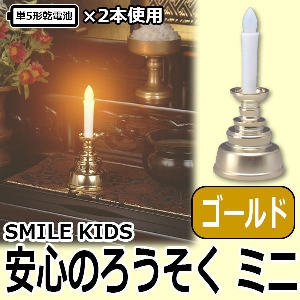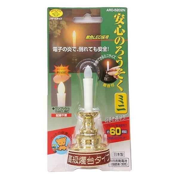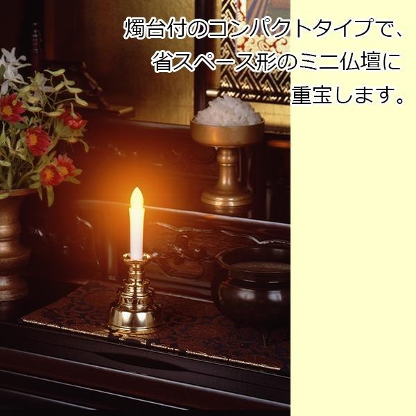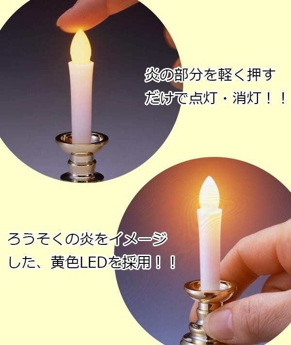 | 電池式なので、マッチ・ライター・配線も不要!スイッチONすればろうそくの先端が黄色く光ります。スイッチは炎の部分を軽く押すだけで点灯・消灯できて簡単。燭台付のコンパクトタイプで、省スペース形のミニ仏壇に重宝します。お墓参りにも携帯しやすく、風が吹いても消えることがありません。1日15分で約7ヶ月使用可能です。 |