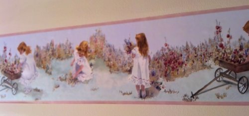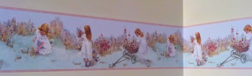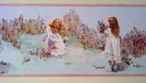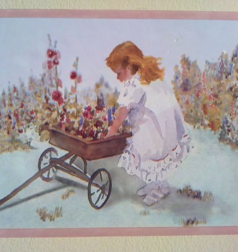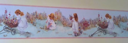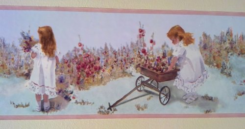 -. Feature : Watercolor image of redhead girls picking flowers. / Gardening Wallpaper Border / 15 Foot Long Spools, Prepasted / 7 Inch Wide Border / Flowers Wallpaper Border