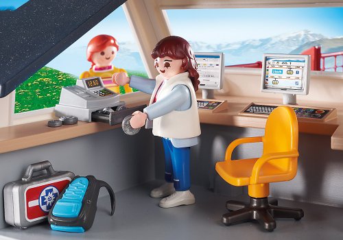 -. Feature : Climb aboard the Alpine Cable Car to travel all the way to the top of the mountain / Families can purchase their tickets at the valley station before climbing into the cable car / In the car's outside compartment, travelers can store gear such as hiking poles, shovels, and more / Rotate the handle at the valley station to move the line and begin the cable car's ascent to the top / Includes four figures, backpacks, valley station, mountain station, cable car, cash register, first aid kit, and more