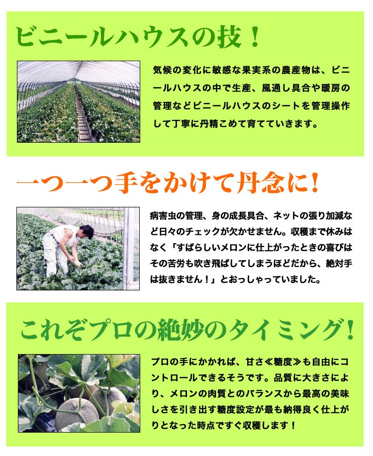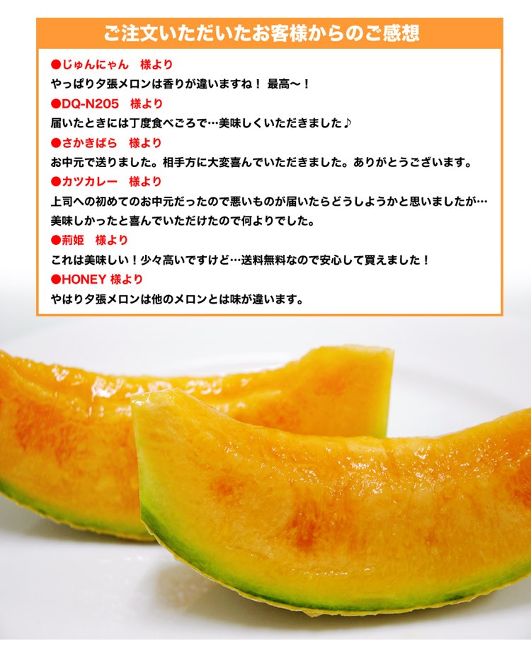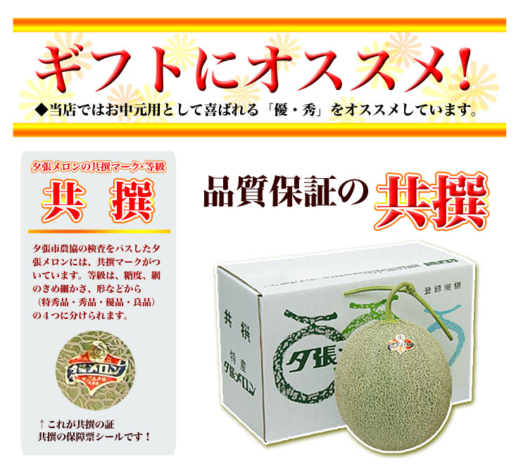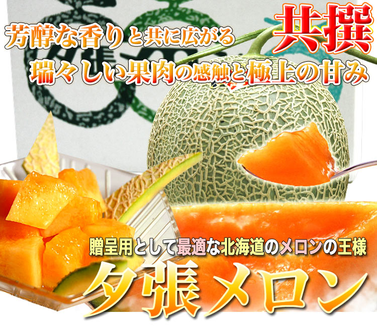 ■名称:【共撰】夕張メロン(優品)■原産地:北海道夕張市■内容量:1玉(約1.3kg前後)■保存方法:届いたらすぐに箱から出し、タッパーからも取り出して下さい。※取り出さないと、メロンのガスが充満し品質劣化の原因となります。冷蔵便にてお届けしている為、表面に水滴(汗)が出る場合がございますので、必ず箱とタッパーから取り出し、常温で熟して下さい。箱から出さないと、カビの原因となります。■お召し上がり方:メロンの底を押上げて弾力を感じたら食べ頃です。冷蔵庫で冷やして召し上がり下さい。■人数の目安:約1~3人前■発送形態:冷蔵発送■同『夕張メロン優品』商品同士のみ同梱可能■発送予定:7月中旬前後頃~7月下旬前後頃から順次■到着日指定不可お中元 内祝い 暑中見舞い 御礼 お礼 誕生日 ゴルフコンペ 贈答 贈り物 ギフト 爆買い 北海道直送