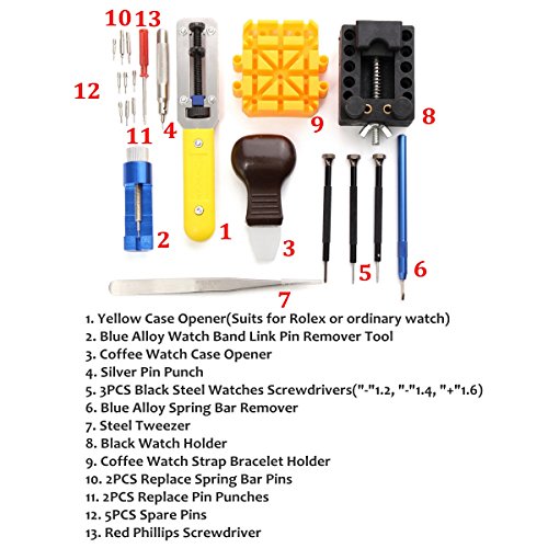 - INCLUDE- Watch Band Link Pin Remover Tool ;Yellow Watch Strap Bracelet Holder ;Coffee Watch Case Opener ;Steel Tweezer; Case Opener(Suits for Rolex or ordinary watch) ; Black Watch Holder ; Spring Bar Remover;Red Phillips Screwdriver ;Silver Pin Pun