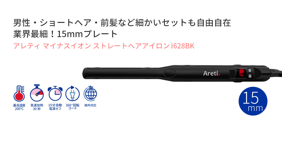 ●スリムな15mmアイロンはストレートからしっかりカールまで使い勝手がよく、男性やショートヘアにもご使用いただけます。前髪のセットにも最適です。