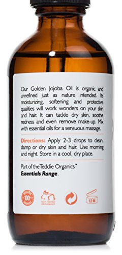 Teddie Organics Jojoba Oil gives your hair the nutrients it needs to be truly rejuvenated and replenished. Extracted from the jojoba tree, jojoba oil is actually a liquid wax that is very similar to the properties of human skin oil, sebum. This makes jojoba oil more easily absorbed than other moisturizers. It only takes a few drops to give your hair the moisture it needs to be visibly radiant and healthy. Our Golden Jojoba Oil is 100% organic, unrefined, cold pressed and free of any harmful chemicals or fillers causing the oil to be less effective. You're covered by our risk free guarantee, if you aren't satisfied with your purchase, we have a no questions asked refund policy because we stand behind every customer, every product, and every purchase.