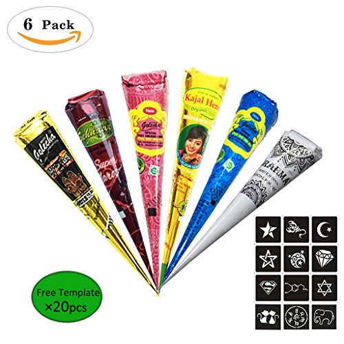 6Pcs India Henna Tattoo Kit, Kicpot Temporary Tattoo Paste Cone Body Art Painting Drawing with 20 pcs Free Henna Stencil Set,Black ,Brown,Red,White,Blue,...