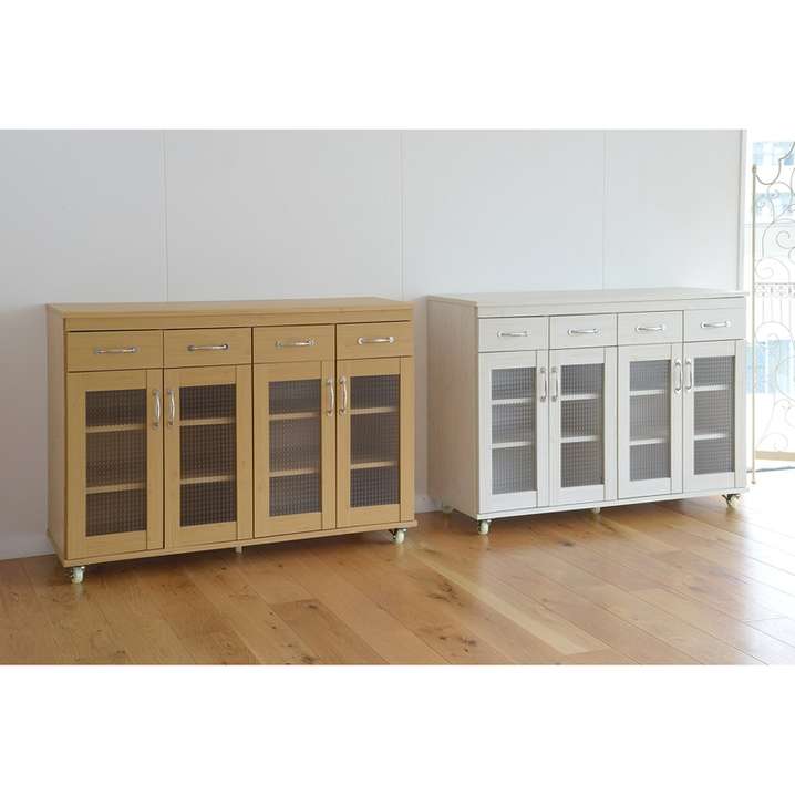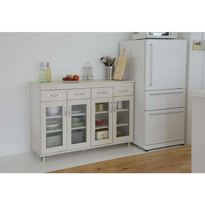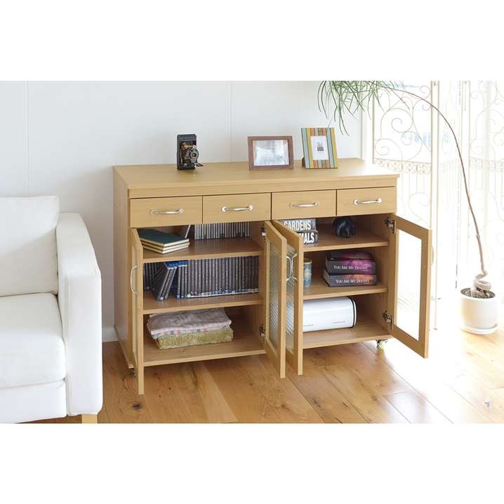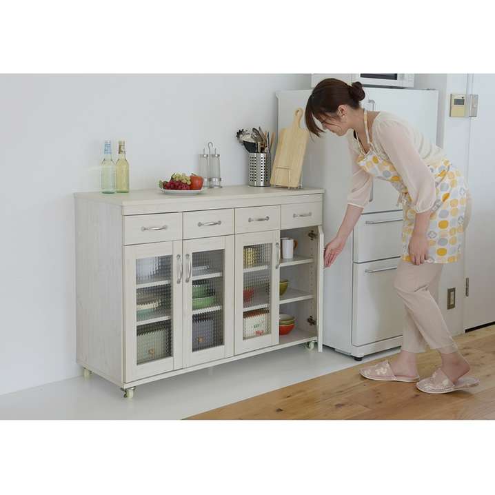●小さめの引出し4つと、大きめのガラス扉収納付なので、カトラリーから食器類の収納に活躍してくれます。