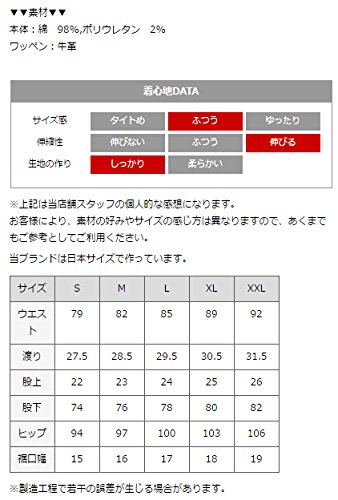 -. Feature : 本体:綿 98%,ポリウレタン 2% / ワッペン:牛革 / 180cm67kg(Lサイズ着用)