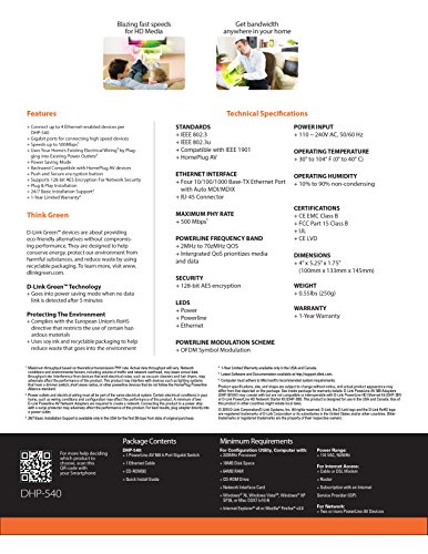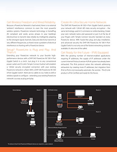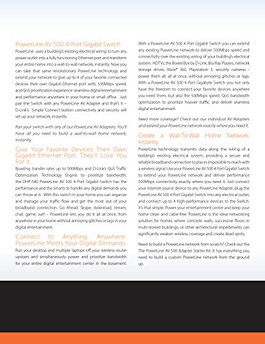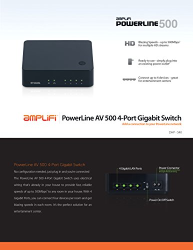 Turn any electrical outlet into a home network connection. The PowerLine AV 500 4-Port Gigabit Switch uses electrical wiring that's already in your house to provide fast, reliable speed of up to 500Mbps to any room in your house. Extend an existing PowerLine network or add another PowerLine AV adapter to instantly create a network connection without any hassle. Simply connect one adapter to an existing outlet and, connect it to your home network router, then plug the DHP-540 into any other room in your house to get instant shared network connections. With 4 Ports, you can connect more devices per room and get blazing speeds in each room without tripping over tangled, messy wires. It's cable management at its best.Feature