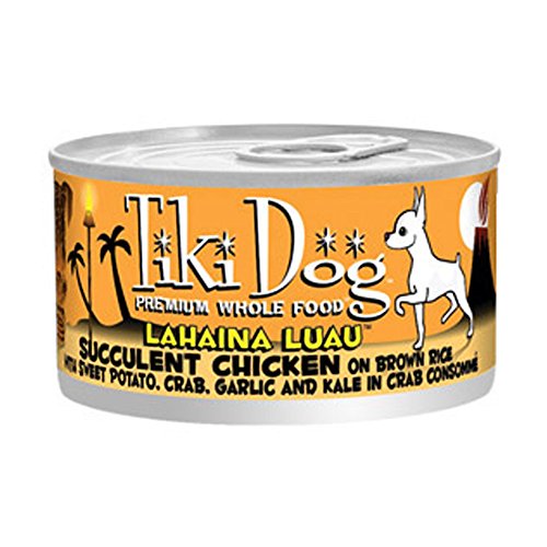 Tiki Dog's Lahaina Luau Recipe is made with shredded chicken breast and tossed with a small amount of brown rice, hand-diced white sweet potato and chopped whole scrambled egg. Shredded crab meat, a couple slivers of whole garlic and cut kale leaves are placed on top, and it's simmered in a crab consomme broth made with the shells and unused portions of the crab in a traditional stock method to produce naturally occurring flavors. Sunflower oil, vitamins and minerals are then added to create a tasty, healthy meal your dog will love. Ingredients: Crab Consomme 39%, Chicken Breast 43%, Brown Rice 4%, Sweet Potato 4%, Crab 3%, Egg 3%, Sunflower Seed Oil 1%, Contains Less Than 1% of the Following: Calcium Lactate, Dicalcium Phosphate, Garlic, Kale, Tuna Fish Oil, Choline Chloride, Vitamin E Supplement, Zinc Sulfate, Ferrous Sulfate, Thiamine Mononitrate, Niacin, Calcium Pantothenate, Manganese Sulphate, Vitamin A Acetate, Potassium Iodide, Copper Sulfate, Riboflavin Supplement, Pyridoxine Hydrochloride, Vitamin D3 Supplement, Folic Acid, Vitamin B12 Supplement.Feature