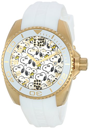 White quartz day with snoopy and date display, white rubber band, push down crown