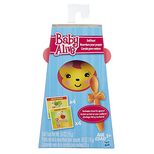 - Feature : Doll Food Pack includes doll food packets / Food works for Baby Alive dolls (sold separately) / 8 doll food packets / Includes bowl and spoon / Get all the doll food your little girl needs for her Baby Alive doll with the Doll Food pack! This big pack includes 8 packets of doll food for hungry little dolls (sold separately), and a bowl and spoon for mealtime. She'll have all the supplies she needs to be able to feed her doll whenever she needs to! Baby Alive and all related characters are trademarks of Hasbro
