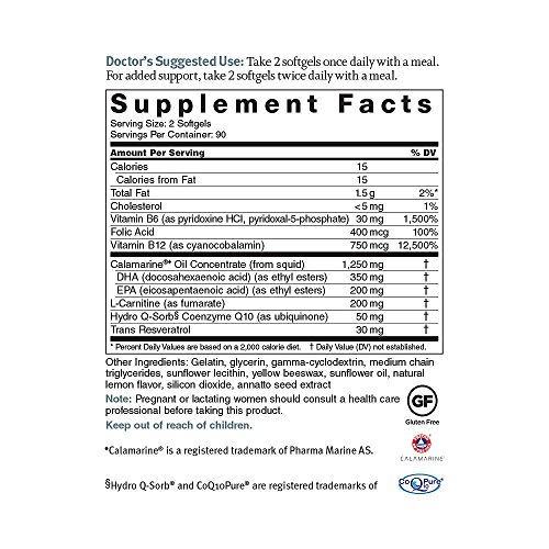 -. Feature : SUPPORT FOR HEALTHY BLOOD PRESSURE, CIRCULATION, , BLOOD VESSEL HEALTH, AND ANTIOXIDANT PROTECTION WITH EXCLUSIVE COMBINATION OF INGREDIENTS FOUND IN OMEGA Q PLUS RESVERATROL. Developed by integrative cardiologist Dr. Stephen Sinatra to bring together a healthy foundation of heart-smart nutrients plus the incredible antioxidant power of resveratrol for outstanding heart health, energy, and circulation support. / PROTECT YOUR BLOOD VESSELS AND SUPPORT CIRCULATION WITH 30 MG of RESVERATROL. Resveratrol is a remarkable antioxidant taken from the skin of red grapes. It helps to protect against free-radical damage to your cells caused by oxidative stress which ultimately helps to promote healthy aging. / HIGHLY ABSORBABLE COQ10 CLINICALLY SHOWN TO RAISE COQ10 LEVELS BY 55%! Omega Q Plus Resveratrol features Hydro Q-Sorb CoQ10, a bioavailable form of CoQ10 up to 8 times better absorbed to feed your mitochondria and provides antioxidant protection against free radicals that can damage your heart health and overall well-being. This powerful heart health supplement has been clinically shown to consistently raise CoQ10 blood levels by 55%! And in statin users, they increased by 60%! / COMPREHENSIVE HEART HEALTH SUPPORT IN ONE DAILY DOSE. Just two little red pills provides protection for your heart, plus support for circulation and arterial health; healthy blood pressure levels; protection against oxidized LDL, support for healthy triglyceride and homocysteine levels; protects your heart, brain and eyes, and support cellular energy production. / A FULL DAILY DOSE OF OMEGA-3S WITH PURE, CLEAN CALAMARINE...AND NO FISHY BURPS! Supplementing with omega-3s is one of the BEST things you can do for your heart, brain, eye, and whole body health. Calamarine oil is a pure, clean, odorless omega-3 oil derived from deep-water calamari (squid), not fish. Calamari are naturally richer in DHA than ordinary fish oil making it a great choice to support your heart, brain, eye and whole body health.