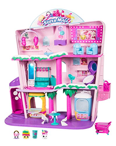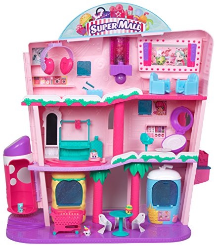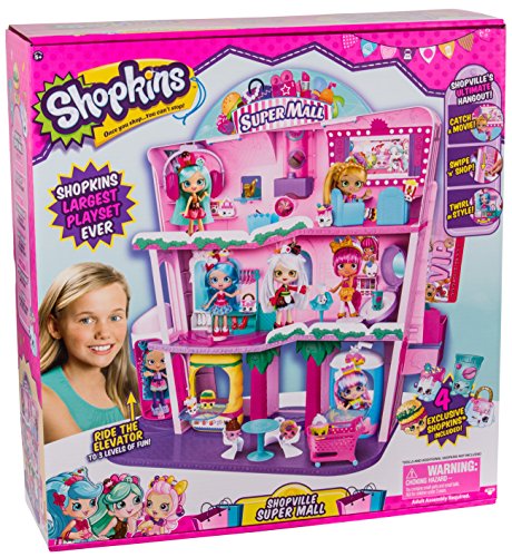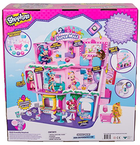It’s Shopkins largest playset ever! The Shopville Super Mall is the ultimate hangout for the Shoppies and their Shopkins! Ride the elevator and discover three levels of fun. There is so much for your Shoppies to do at the Shopville Super Mall! - Check out some tech, twirl along the fashion walk at the boutique, grab a bite with friends at the food court or catch a movie! Packed with fun moving features and 4 exclusive Shopkins, the Shopville Super Mall is the perfect place for a day out with your best friends!Feature