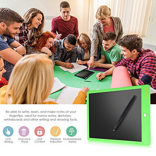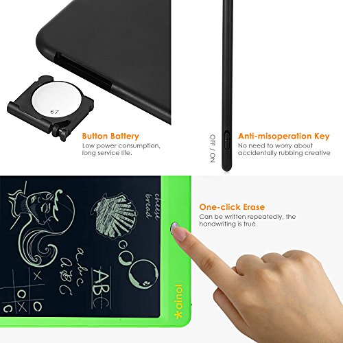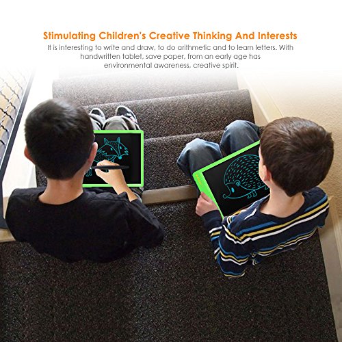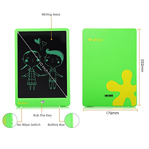 -. Feature : Thin and Lightweight Design - The board is incredibly thin and light, easy to be put in bag and taken to office, school, you can create your ideas everywhere / LCD Screen - This board tablet is equipped with 10 inch high-quality LCD screen, you can write or draw with the plastic stylus or any other suitable instrument, even your finger / Pressure-Sensitive - This writing board has pressure-sensitive LCD writing surface, which creates lines of different thickness based on how hard you push, just like paper and pen / No Eraser - Erase your drawing image with the press of button, no need to use eraser anymore, Eco friendly learning and education tool both for students and teachers and other people / Built-in Battery - The electronic board is build in CR2032 button battery, which is replaceable , it can erase up to 15,000 times