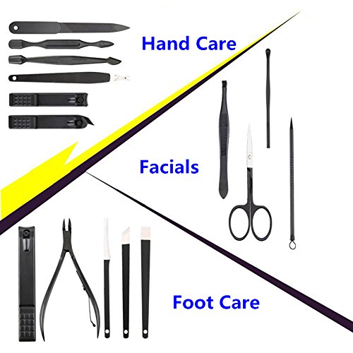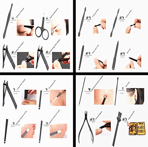 Package includes: ?3 x Nail Clippers: Used for trimming fingernails, toenails, and hangnails. ?3 x Peeling Knives: Used for peeling off the dead and rough skin ?1 x Cuticle Trimmers: Used for cutting off the cuticle ?1 x Cuticle Pusher and Nail Cleaner: Curved flat end perfectly pushes the skin back flawlessly and sharp end cuts or scrape away dead cuticle ?1 x Toe-Nail Nipper: Used for safely clipping off ingrown nails ?1 x Nail File: Used for refining and strengthening sharp and rough nail tips ?1 x Dead Skin Fork: Used for trimming cuticles with ease in no time ?1 x Eyebrow Tweezer: Used for shaping up brows flawlessly by removing all unwanted eyebrow ?1 x Eyebrow/Moustache Scissor: Used for cutting and crafting with ease and comfort ?1 x Acne Needle with Loop Blackhead: Used for removing blackheads, acne, and various blemishes ?1 x Ear Pick: Used for cleaning ear canal or earwax ?1 x Cleaning tools