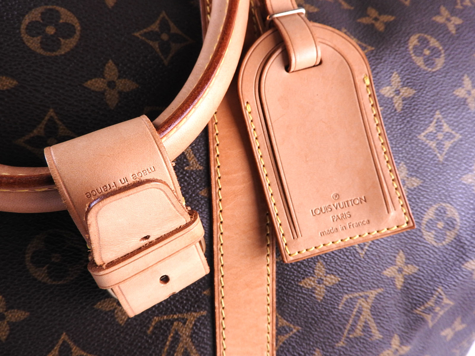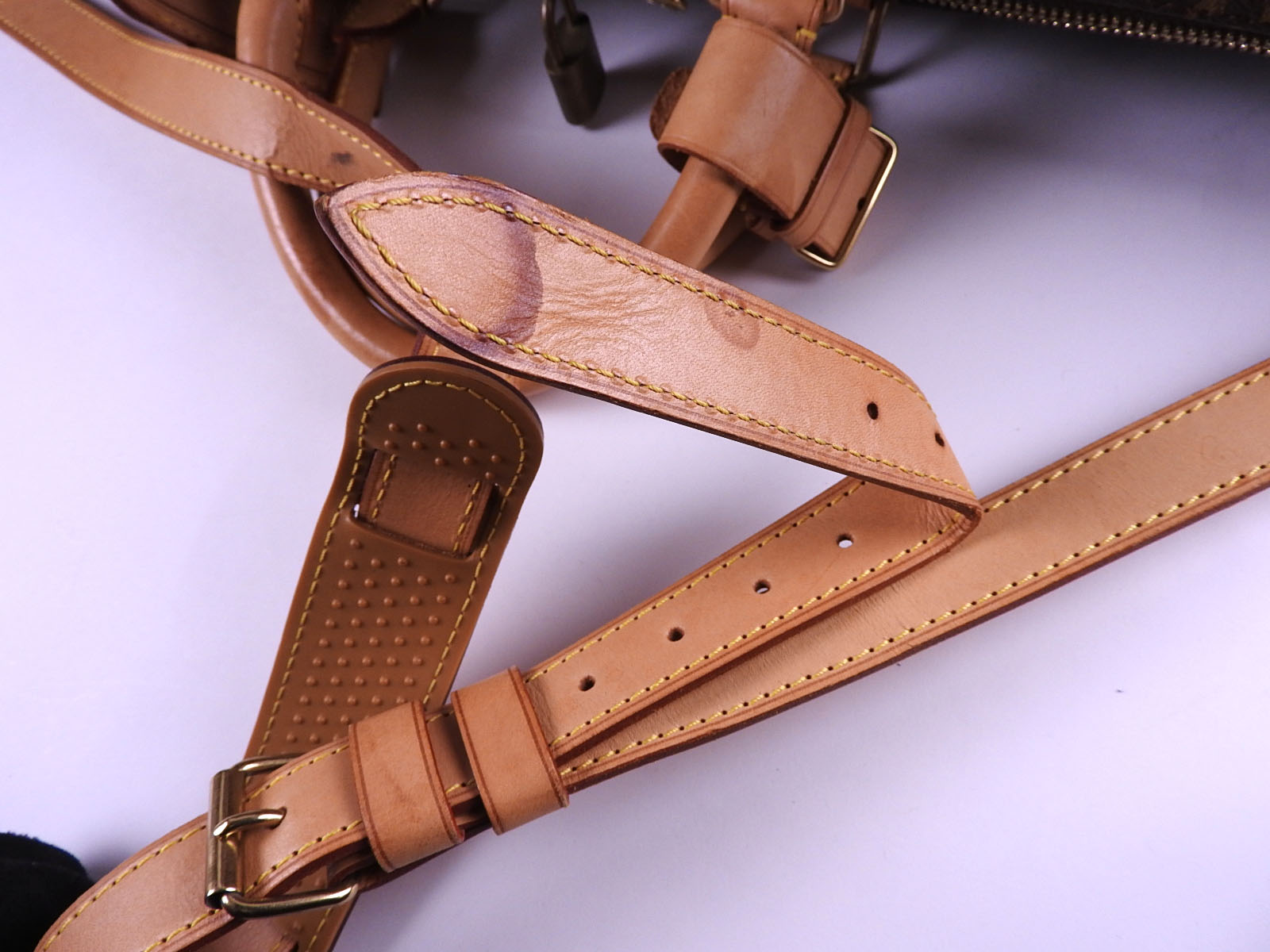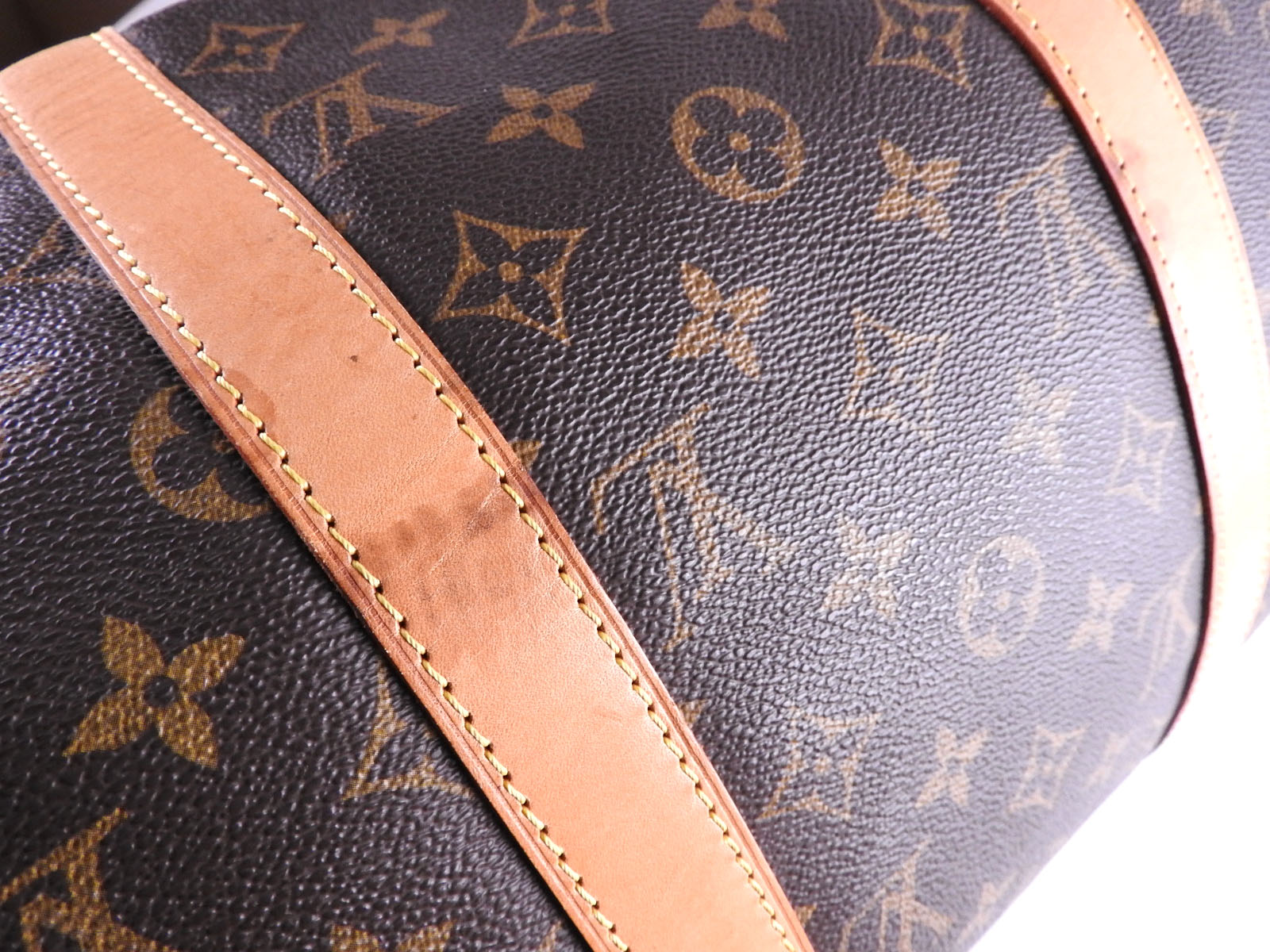 Monogram: Slightly used feeling. Slight stains and wrinkles. Leather: Used feeling. Some stains, wrinkles, tanning and small cracks. |