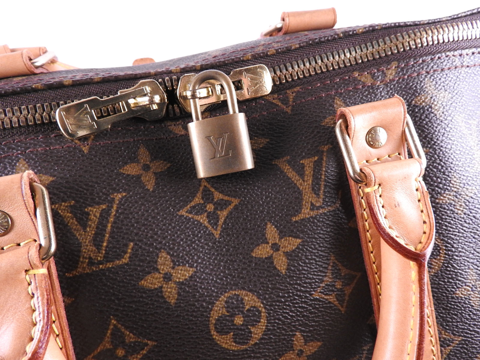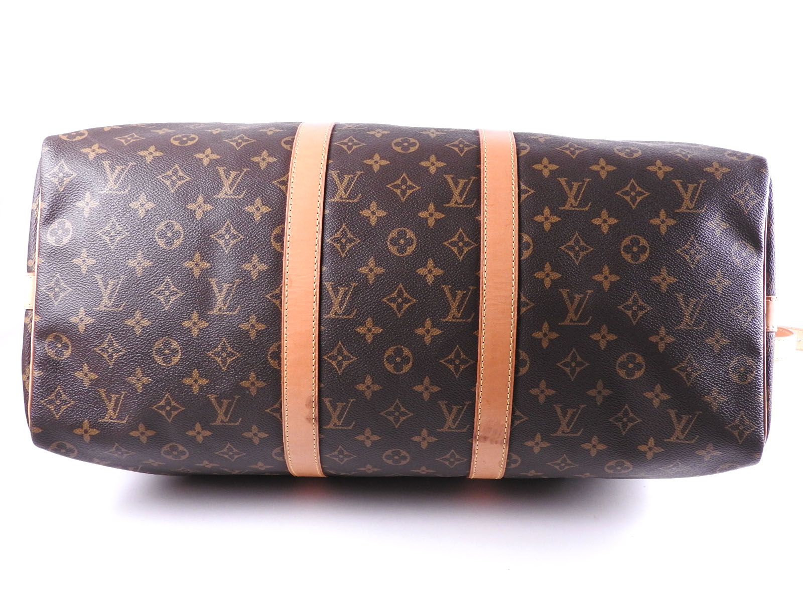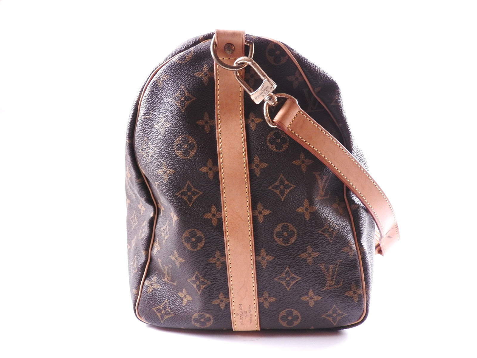 Monogram: Slightly used feeling. Slight stains and wrinkles. Leather: Used feeling. Some stains, wrinkles, tanning and small cracks. |