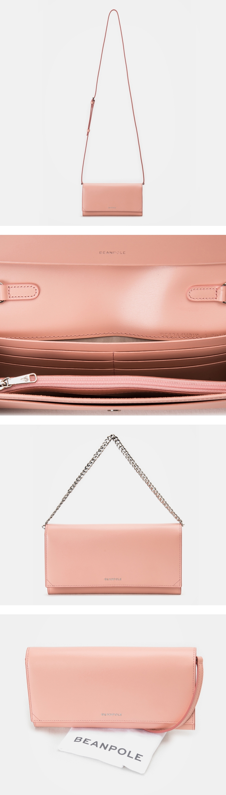 민자 가죽처럼 보이지만 잔잔하게 결이 있는 가죽 소재로 시각적인 효과를 주었으며, 체인과 가죽스트랩 모두 내장되어 투웨이 스타일로 연출이 가능한 장지갑입니다.