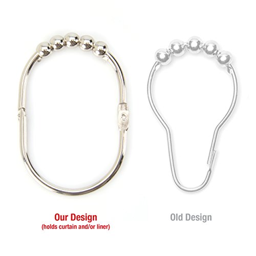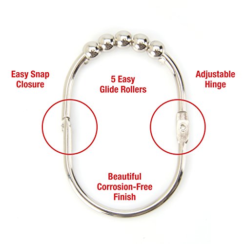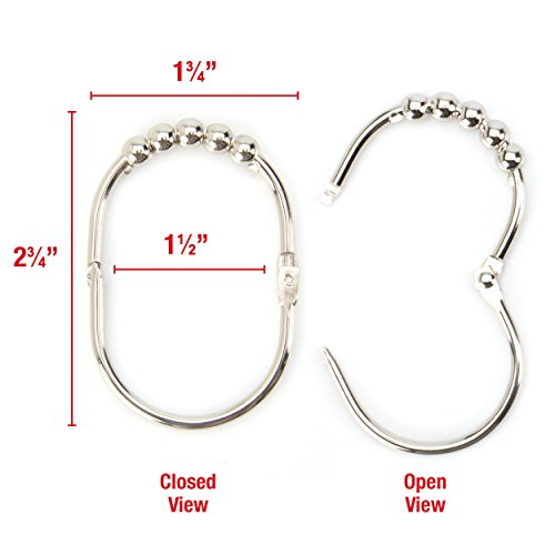 ★ EASY FIT, EASY GLIDE ★ Our heavy duty shower curtain hooks are designed for effortless gliding across all standard size shower curtain rods, from 60" - 72". The unique 5-roller ball design reduces friction and tears — gliding smoothly and easily across any 3/4" to 1 1/8" diameter, straight or curved shower curtain rods.