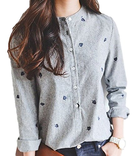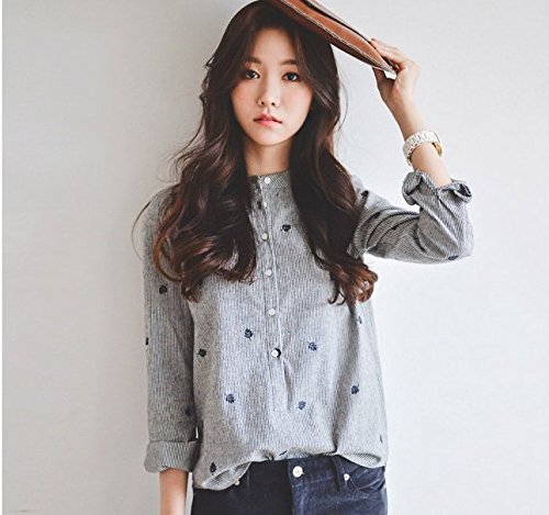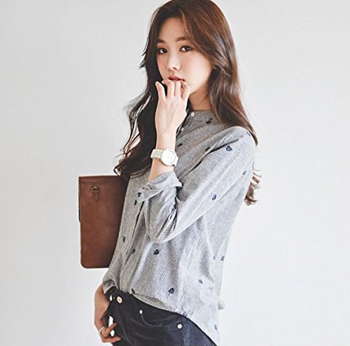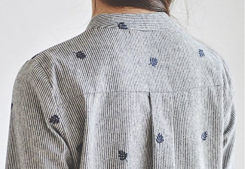 -. Title : (ロンショップ)R.O.N shop ストライプ 柄 シャツ ブラウス リーフ 刺繍 デザイン グレー ネイビー ブラック レディース トップス 長袖 春 夏 秋