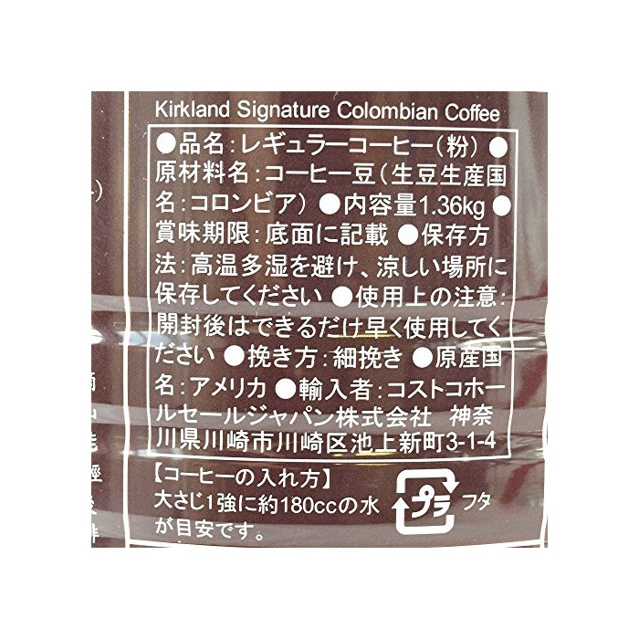 원본상품명: #373327 カ?クランドシグネチャ 100% コロンビアコ?ヒ? 1.36kg 粉 Kirkland Signature Colombian Coffee