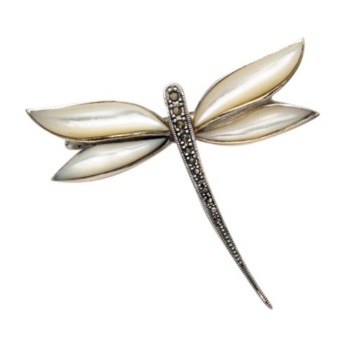 -. Title : Sterling Silver Art Deco Dragonfly Pin w/Marcasite Body & Mother of Pearl Wings