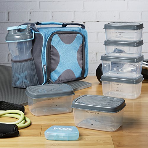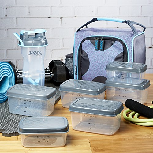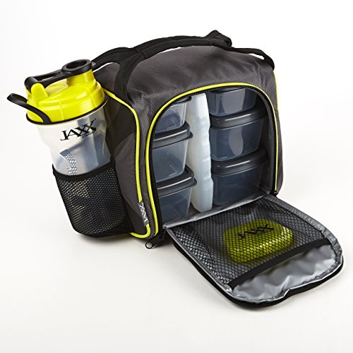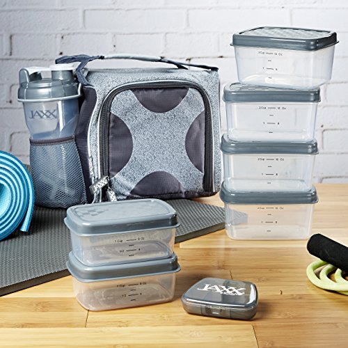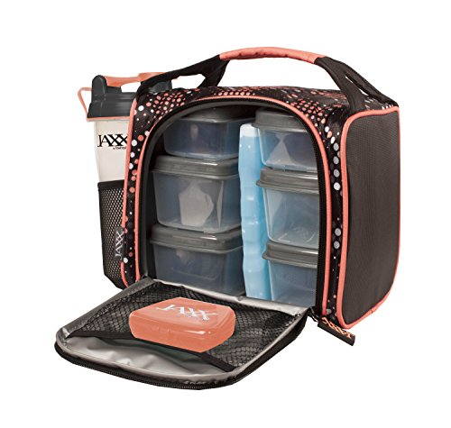 The Jaxx FitPak by Fit & Fresh is one of the leading meal prep bags available on the market today. It consistently receives positive reviews from a wide variety of buyers including men and women who are trying to eat a little healthier, others who are dieting and trying to lose weight, serious athletes who are training for a competition or race, and others who need to pack their own food because of food sensitivities or allergies. No matter your reason, the Jaxx FitPak has everything you need to fuel your day. The FitPak includes an insulated bag, six leakproof containers (two 1-cup containers and four 2- cup containers), a patented 28-ounce Jaxx Shaker bottle, a pocket pack for vitamins, supplements or medication and a large reusable ice pack. The bag is large enough to pack a whole day’s worth of portion controlled meals, a protein shake or smoothie and your daily dose of supplements, yet compact enough bring to school, the office or job site or to pop into the fridge at home or work. The bag comes in a variety of colors and patterns and has gray PEVA lining that is easy to wipe clean and is PVC and BPA-free. Pack protein rich chicken and nuts in some containers and servings of fruits and veggies in the others and the contents will stay chilled all day with the non-toxic, reusable ice pack. Use the 28-ounce Jaxx Shaker cup to hold water, a smoothie or protein shake. The powerful patented Jaxx agitator breaks up and mixes protein powder and drink mixes with ease. The agitator's unique shape and heavier design break up clumps and produce smooth shakes every time. The bag zips fully closed and has an interior mesh pocket. The set also includes a vitamin pack, a small pill container with 5 compartments, that easily slips into the inner mesh pocket or into your pocket to take on-the-go. Ice pack and agitator should not be put in the microwave or dishwasher. The empty bag measures 9" long x 7" deep x 8" tall. With containers and shaker bottle, it measures 12" long x 7" deep" x 9" tall.Feature