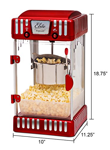 Traditional hot oil kettle popcorn popper makes up to 1 gallon of popcorn per batch and powered at 300 watts with popcorn tray measuring 9.5" x 8.5" x 2.5"