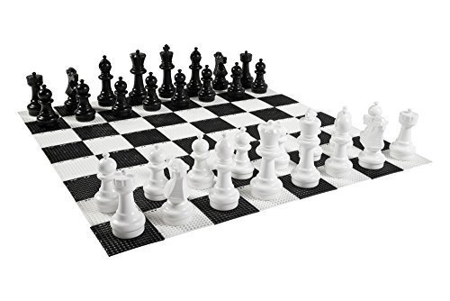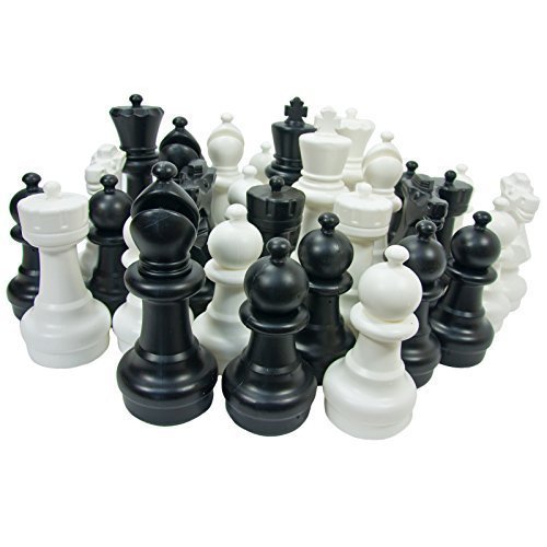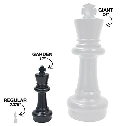 Feature : (2) Kings - 12 inches tall; (2) Queens - 11 inches tall; (4) Bishops - 10 inches tall; (4) Knights - 8.5 inches tall; (4) Rooks - 8 inches tall; (16) Pawns - 7.5 inches tall / Made with durable PVC; Waterproof and UV protected; Built to last / 1 piece construction; Water or Sand can be added for more stability in strong winds / Perfect for playing at the park, the beach, a BBQ or in your backyard / Garden Chess Game Board and Game Mat are sold separately