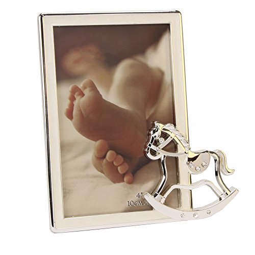 -. Feature : Outside of the frame it is silver plated and the inside boarder is a pearl finish. / Free standing only, this can not be wall hung. Actual frame measures approximately: 6.5" tall x 6" wide x 0.5" deep. / There is a rocking horse icon raised on the right hand side of the frame. It features several crystals across the horse. / The photo section measures 4" by 6". This product is also supplied in a gift box. / Will make for a super gift or a fun keepsake item to display.