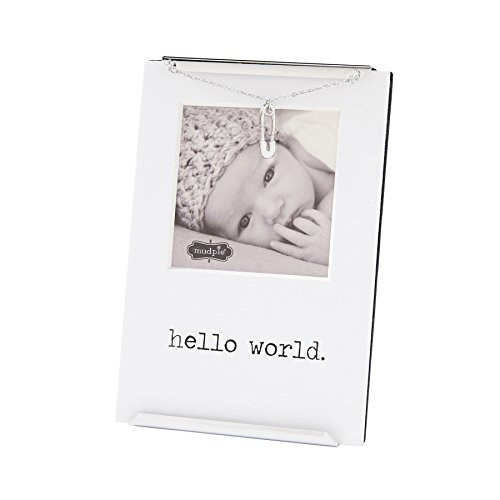 GLASS CLIP FRAME is perfect for newborn baby picture, with diaper pin charm on chain and "Hello World" printed sentiment. Frame stands as easel, measures 5 x 3.5 inches and holds a 2.5 x 2.5 inch photo.