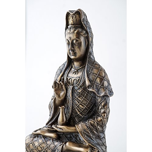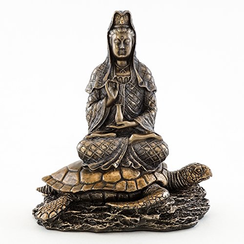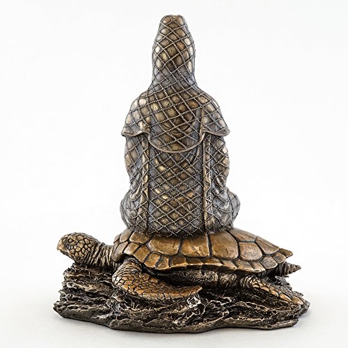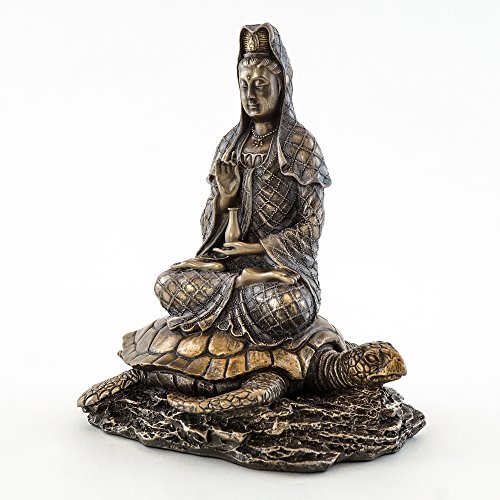 Top Collection Small 6.5" H 5.5" W Guan Yin in Lotus Pose Rising from the Sea on Turtle Figurine. Bronze Powder Mixed with Resin - Bronze Finish with Color Accents. East Asian Buddhist Deity Goddess of Compassion and Mercy.