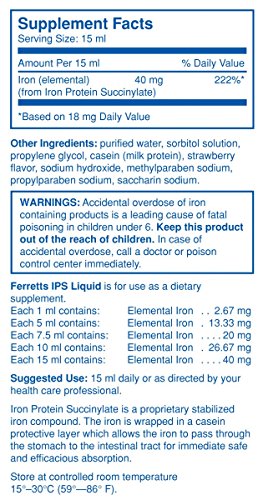 Ingredients: Each 15ml contains RDAIron (from Iron Protein Succinylate) 40 mg 222 percent Ferretts IPS Liquid Iron is for use as a dietary supplement. Other Ingredients: Purified water, sorbitol solution, propylene glycol, casein (milk protein), strawberry flavor, sodium hydroxide, methylparaben sodium, propylparaben sodium, saccharin sodium. DOSAGE: Each 1ml contains: 2.67 mg iron (237 x 1 ml doses) Each 5ml contains: 13.33 mg iron (47 x 5 ml doses) Each 7.5ml contains: 20 mg iron (32 x 7.5 ml doses) Each 10 ml contains: 26.67 mg iron (24 x 10 ml doses) Each 15 ml contains: 40 mg iron (16 x 15 ml doses)