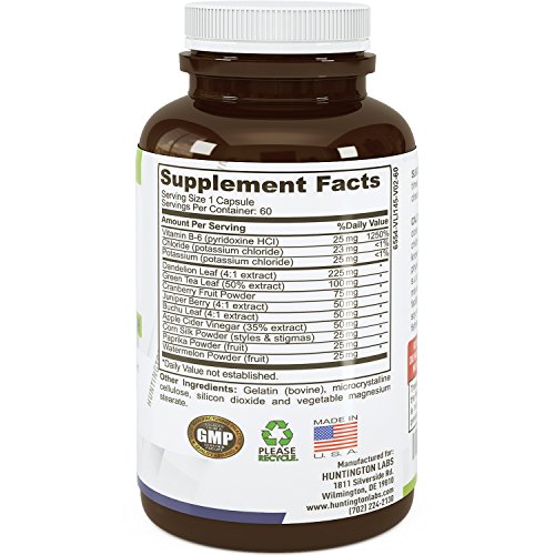 -. Binding : Health and Beauty -. Brand : Huntington Labs -. Feature : WATER PILLS FOR WEIGHT LOSS: The active ingredients Vitamin B6 Dandelion Root and Potassium work in synergy to reduce frustrating symp of water retention such as bloating weight gain and fatigue. / NATURAL DIURETIC: Diuretics are used to rebalance water levels to a healthy state. This results weight loss as well as increased energy and metabolism. Diuretics are also used to treat a range of medical conditions which are the result of improper sodium levels. / ANTIOXIDANT BENEFITS: These water pills contain a proP.R.Ietary blend of various vitamins minerals and herbs that detox and cleanse the body. With antioxidants cranberries and green tea extract these capsules protect your body on a cellular level. / Natural and Effective: These effective water pills are made with natural ingredients provide relief with water weight, bloating, and weight loss. / 100% Money back Guarantee: This natural formula works well with other supplements and promotes a healthy lifestyle using pure natural ingredients to help you with a new and improved weight loss solution! -. IsAdultProduct : 0 -. Label : Huntington Labs -. Manufacturer : Huntington Labs -. MPN : LE -. PackageQuantity : 1 -. PartNumber : LE -. ProductGroup : Health and Beauty -. ProductTypeName : HEALTH_PERSONAL_CARE -. Publisher : Huntington Labs -. Studio : Huntington Labs -. Title : Diuretic Water Pills For Bloating - Water Pills Weight Loss Supplement for Women and Men - Detox and Cleanse Dietary Supplement for Water Retention with Vitamin B6 Potassium & Dandelion Root Extract