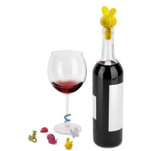 Stopper measures 2-1/4 inches by 3-1/2 inches by 2 inches and wine glass charms measure on average, 3/4 inches by 3/4 inches by 1-1/2 inches