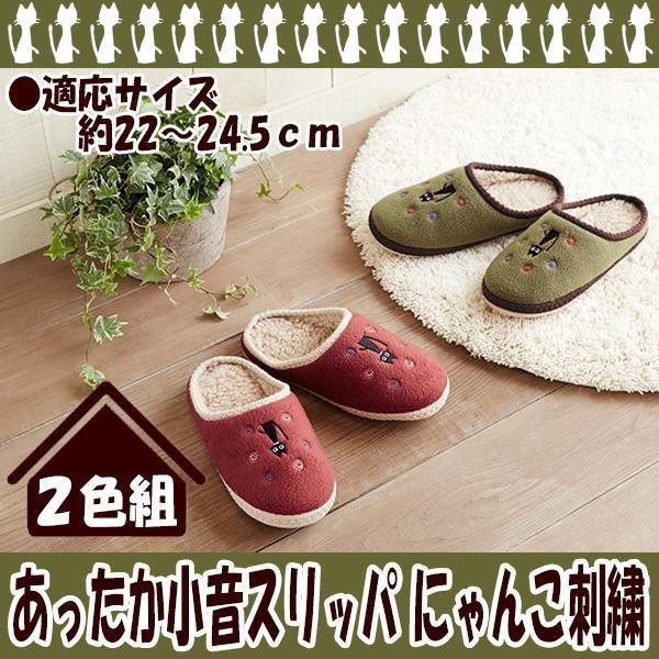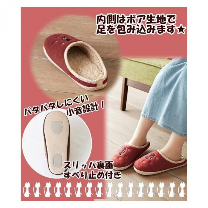 内側のボア生地が足を包み込む暖かスリッパ。甲にはキュートな黒猫の刺繍入り。底はパタパタしにくい小音タイプのスリッパです。スベリ止めも2ヵ所付いています。セットがうれしい2色組です。 |