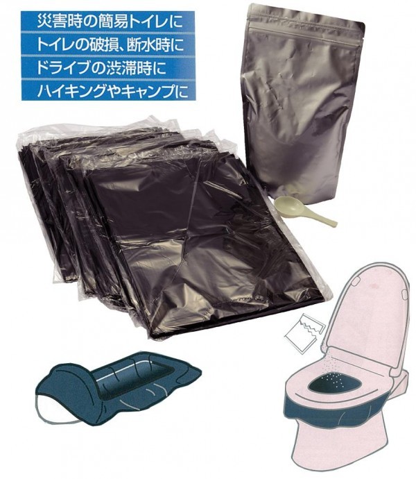 | 周りに水がない状況でもトイレが出来るセット40回分です。災害時の断水、キャンプ等でトイレがない時に役に立ちます。凝固剤が尿をゼリー状に固めるので処理が簡単です。いざというときのために。 |