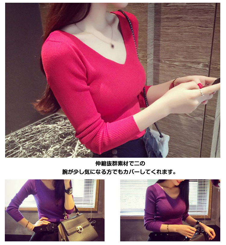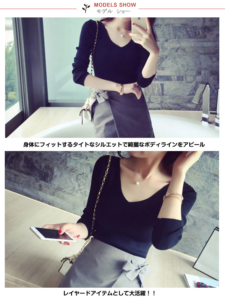 | タイトな曲線に憧れて・・・スリムフィットニットトップス。身体にフィットするタイトなシルエットで綺麗なボディラインをアピール?レイヤードアイテムとして大活躍!!色違いで持っていても役立つ。伸縮抜群素材で二の腕が少し気になる方でもカバーしてくれます。 | |