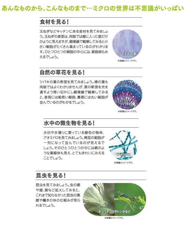 | セット内容 | 顕微鏡本体、接眼レンズ45倍用(顕微鏡にセット済)・100倍用、スマートフォン用アダプター、プレパラート、スライドグラス、カバーグラス、採集ビン、ピンセット、取扱説明書、保証書(保証期間:1年間) |