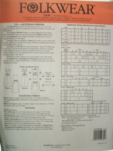 -. Feature : Folkwear Pattern #123 Austrian Dirndl (Not finished garment) / Misses sizes 8 - 16 (Bust 31 1/2" - 38", Waist 24" - 30") All Sizes in one Envelope / Pattern for 2 dresses, 2 blouses and apron / Instructions for decorative embellishment and custom fitting