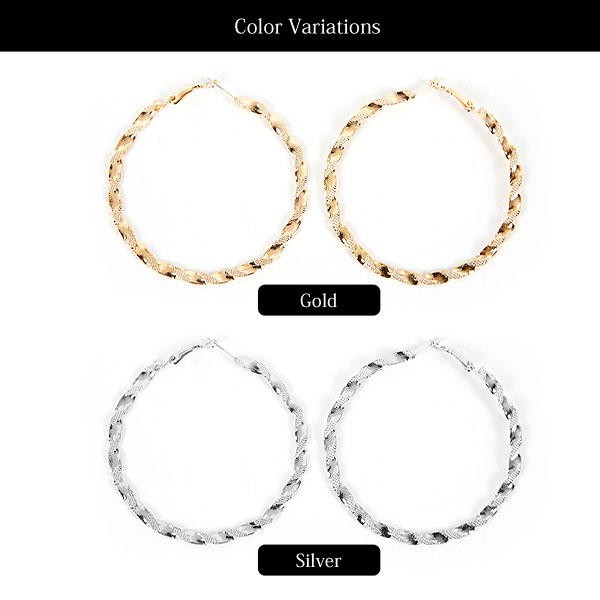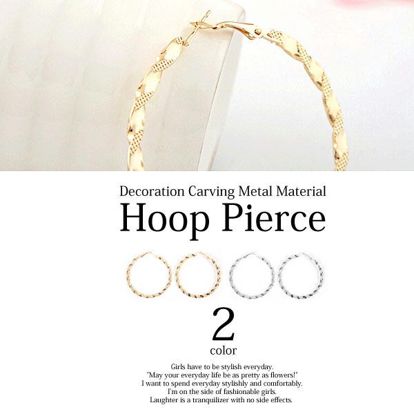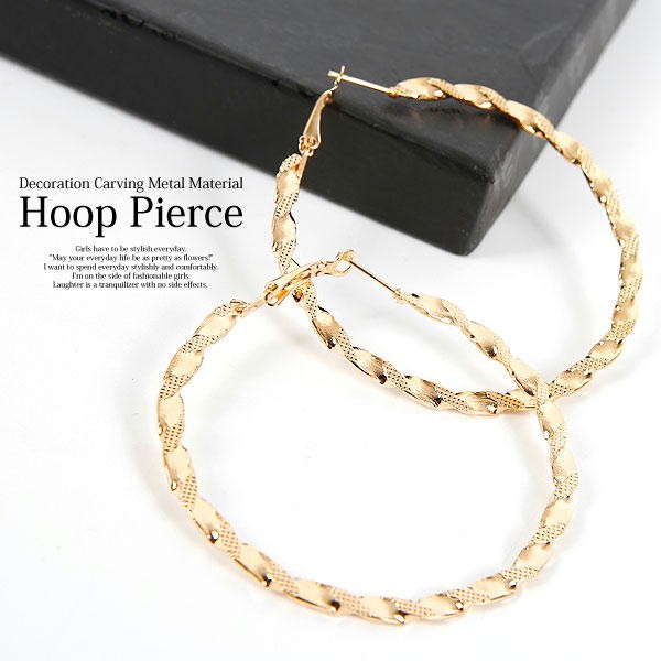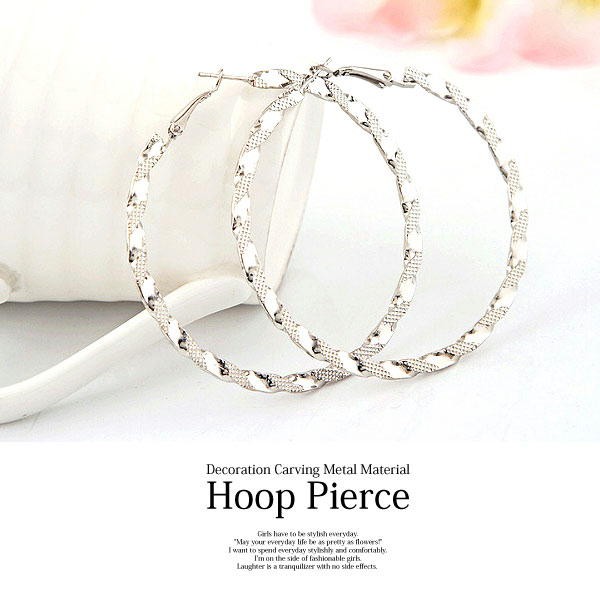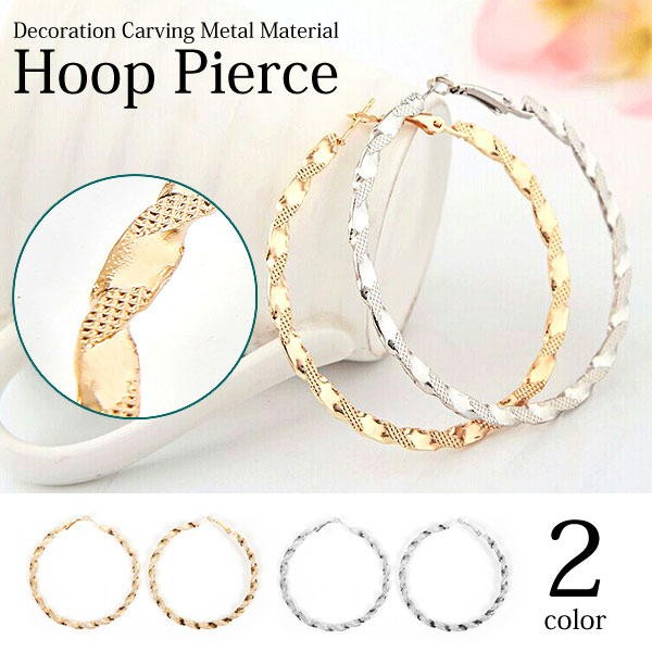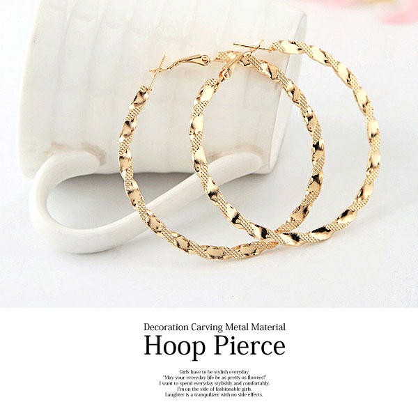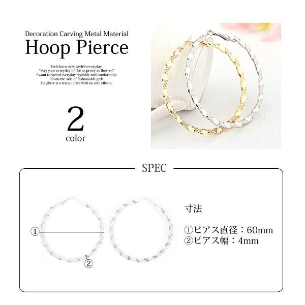 <<スーパーSUMMER SALE>>★全2色!飾り彫りデザインメタルフープピアス★ちょっと厚めの飾り彫りのフープピアスです。定番の物よりインパクトがあってカワイイですよ。シンプルデザインで色々なシーンで活躍すること間違いなし!大人カワイイが演出できます。■商品詳細■ピアス直径:約60mmピアス幅:約4mm※注意事項※商品画像はできる限り実物の色に近づけておりますが、モニター・パソコン等の画像解像度により実際の商品と多少色味が異なる場合がございます。サイズは平置きサイズとなりますので、測り方により誤差が出る場合がございます。予めご了承くださいますようお願いいたします。
