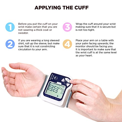 ✭ EASY to READ SPHYGMOMANOMETER - - Get the upper hand on monitoring your cardio health & wellness with this FDA Approved digital auto wrist blood pressure machine monitor. This great piece of kit comes with a large LCD Display Screen that makes it extremely easy to read your test results accurately, to chart for charts, which are displayed in a large font and an adjustable cuff size. Data is stored on flash memory storage system, so even with no power you won`t lose your tester results in the reader. pt