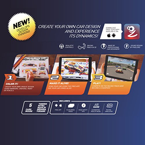 Color the car with pencils, markers or pens. Scan your colored page using the Ozhi app and see it come alive! Tap the "Race" button on top of the screen and compete with other cars on a racing track! Ozhi - a whole new way of coloring. Ozhi changes coloring forever by blending traditional coloring with an augmented reality experience. With a special app, kids can take coloring to the next level, bringing their creations to life. Ozhi comes with 10 action coloring pages with 10 unique racing cars. Also included most common road safety tips and app download for iOS, Android, and Windows devices. Works on iOS 7.0, Android 4.0+ and iOS 5.0. Children can color 10 race cars, then scan them and watch as drawings come to life and interact on their devices with the Ozhi app. Kids will love to play with their unique drawings, beep and drift in real racing video game. Ozhi app interface is easy to understand, allowing kids to color, save and share their cars with friends.