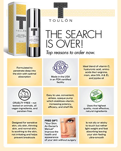 -. Binding : Misc. -. Brand : TOULON -. EAN : 0820103107228 -. Feature : LOOK & FEEL SEXY FOR SUMMER WITH MOST EFFECTIVE FACIAL ANTI-AGING VITAMIN C & HYALURONIC ACID SERUM: Moisturizes and Rejuvenates without Clogged Pores or Breakouts. Builds Collagen, Diminishes Fine Lines and Wrinkles, Lightens Age Spots, Minimizes Pore Size, Brightens Skin, Lessens Dark Circles and Puffiness Under the Eyes, and Fades Acne Scars. Order Today for Healthy, Gorgeous Skin. / VERSATILE: Perfect for All Women or Men including those with Sensitive, Oily or Dry Skin. Use with Moisturizer, Cream and Make-up / Foundation. Deeply Penetrates the Skin to Hydrate and Deliver Organic Nutrients. / SMART PACKAGING: 1 oz. Opaque Bottle with Airless Pump Keeps Air & Light Out to Guarantee Treatment Integrity & Stability. Potent Ingredients Absorb Quickly into Skin to Guarantee Anti Wrinkle Results ... Smoother, Clearer More Youthful Looking Skin. You Deserve Vibrant, Silky Smooth Skin Again. / NATURAL & CRUELTY-FREE: Our Advanced Clinical Grade, Exclusive Spa-Quality 20 % Formula Uses 100 % Pure Vegan Hyaluronic Acid. Best Paraben-Free, Gluten-Free, Cruelty-Free, Fragrance-Free Topical Skin Care Product. Made in the USA to Maximize Antioxidant Protection, Fighting Free Radical Damage which Causes Premature Aging. / FREE E-BOOK & MONEY BACK GUARANTEE: Order Includes a FREE GIFT, "Your Skin: An Owner's Manual." Order Now at No Risk with our 60 Day No-Question-Asked Return Policy. -. ProductGroup : Beauty -. ProductTypeName : BEAUTY -. Title : Vitamin C Serum with Hyaluronic Acid for Face; Reduce Wrinkles & Sun Spots; Natural and Organic; No Risk -. UPC : 820103107228