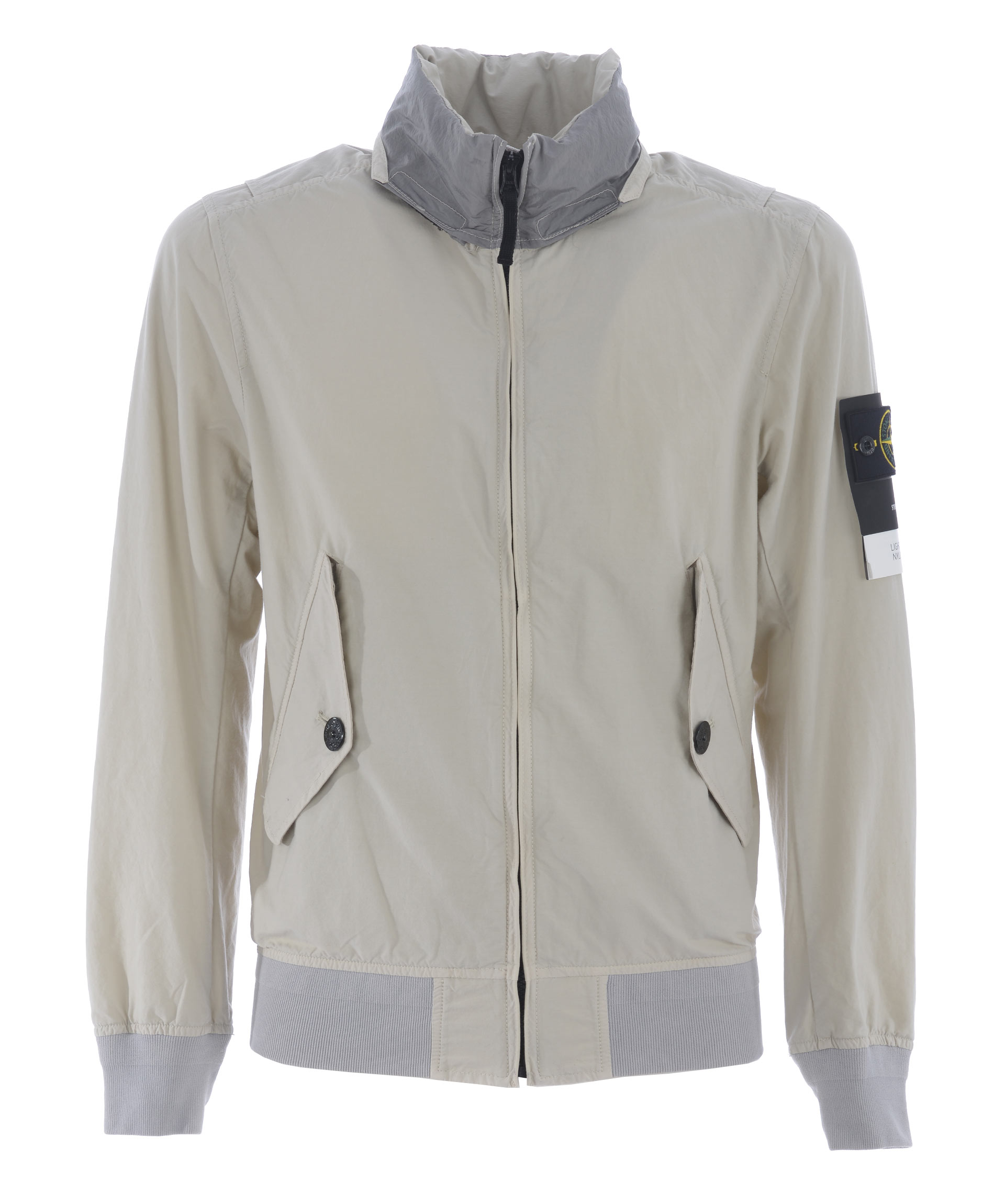 Giubbotto Stone island "light cotton nylon twill" in tela di cotone misto a nylon Beige. Collo alto in nylon metal grigio con cappuccio inserito all'interno. Tasche con pattina e bottone. Chiusura con zip. Polsi e fondo in maglia a costine. Soffietti sul retro. Sfoderato.