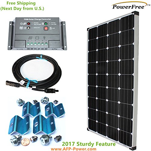 -. Brand : PowerFree -. EAN : 0750343100034 -. Feature : MonoPlus solar cells are more sensitive to sunshine. That generates 3% more power to your battery during sunrise and sunset hours. A professional commercial grade panel though we are not the cheapest! / Complete Solar Charger Kit that includes 150w MonoPlus monocrystalline panel with MC4 connectors, 20amp solar charing controller, 40ft UL 12AWG 600v cable with MC4 connectors, and Mounting 1/8" thick Z-bracket kit. / Its dimensions are 57-1/2 inches x 26-3/16 inches x 1-1/2 inch (35mm) with weight 25 lbs. / Tempered front glass maximizes impact resistance. Corrosion-resistant aluminum frames with reinforced joints are more durable than most roofs. / 25-Year Warranty, Free Shipping and No Sales Tax to You. -. Label : AFP Power -. LegalDisclaimer : No Sales Tax Be Charged from You. We are based in Missouri. We take care of Missouri customers' sale tax. -. Manufacturer : AFP Power -. MPN : PF-P-150w-Kit -. PartNumber : PF-P-150w-Kit -. ProductGroup : Lawn & Patio -. ProductTypeName : OUTDOOR_LIVING -. Publisher : AFP Power -. Studio : AFP Power -. Title : MonoPlus Solar Cell 150w 150 Watt Panel Charging Kit for 12v Battery RV Boat -. UPC : 750343100034