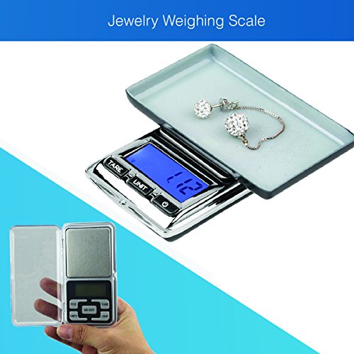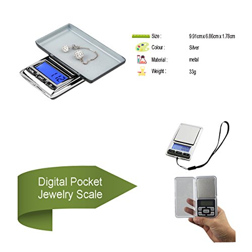 Product Description This jewelry weight scale is so compact and can fit to even smallest of pockets. Very portable and easy to carry around. Can weigh jewelry items up to 200g and Graduatiob Value of 0.01 g. Made from top metal materials and polished with Silver color. It's an electronic device operated by batteries. The design has LCD Screen for easy reading of measurements. It has a simple function keys and high-precision sensors. 0